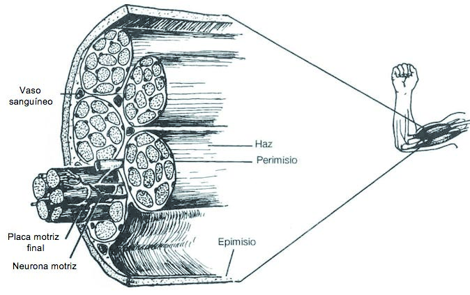 Los músculos del aparato locomotor se encuentran rodeados por una fina capa de tejido conjuntivo, el epimesio. Los músculos se encuentran formados por cientos de células llamadas también fibras musculares. Las fibras musculares se unen a los huesos por los tendones. Las fibras musculares están rodeadas por un tejido conjuntivo llamado perimesio y se encuentran agrupadas formando haces.